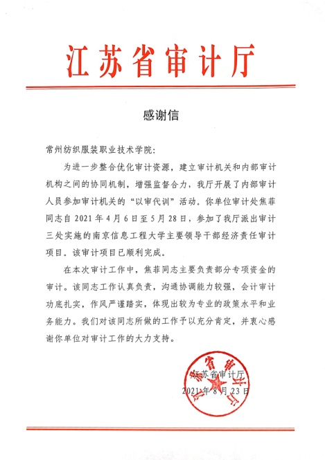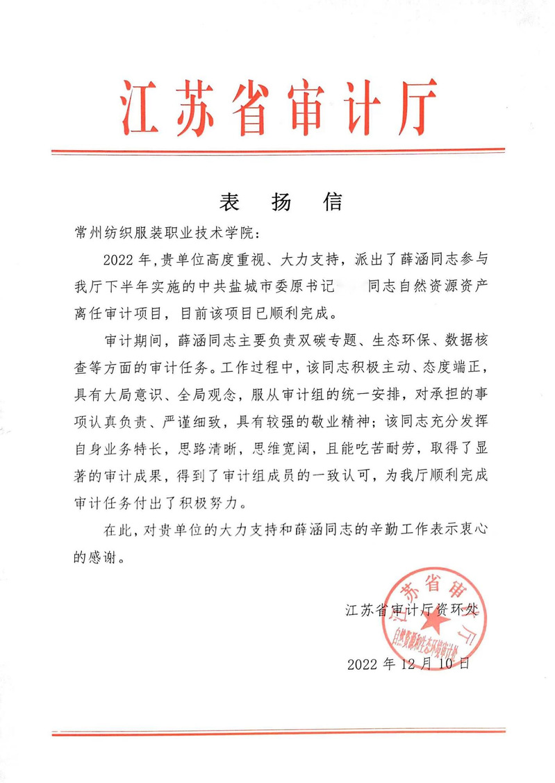 江苏省审计厅向我校致表扬信