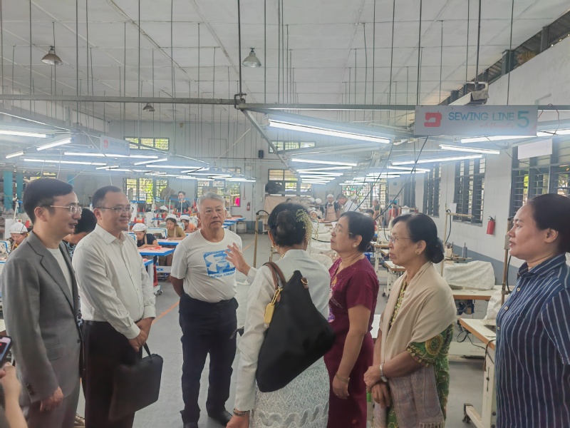 12月8日,代表团一行赴仰光服装工业园区调研,受到青岛帅美控股有限公司董事长董继先、总经理于志华的热情接待。马昀介绍了我校办学特色及赴缅甸开展纺织服装培训的意向。董继先介绍了青岛帅美控股等中方股资缅甸企业的人才需求情况,并对我校赴缅甸开展技能培训的做法表示高度认可,明确表示给予支持。双方就员工培训面向的岗位与技能要求达成一致。随后,我校代表团在董继先董事长的陪同下考察了服装生产车间,详细了解了设备配置及使用情况。此外,代表团一行还与国泰华盛景泰、杰克科技旗下杰耀自动化等中资企业就校企合作开展职业技能培训工作开展深入交流。