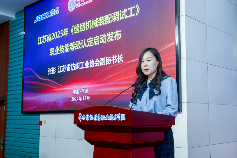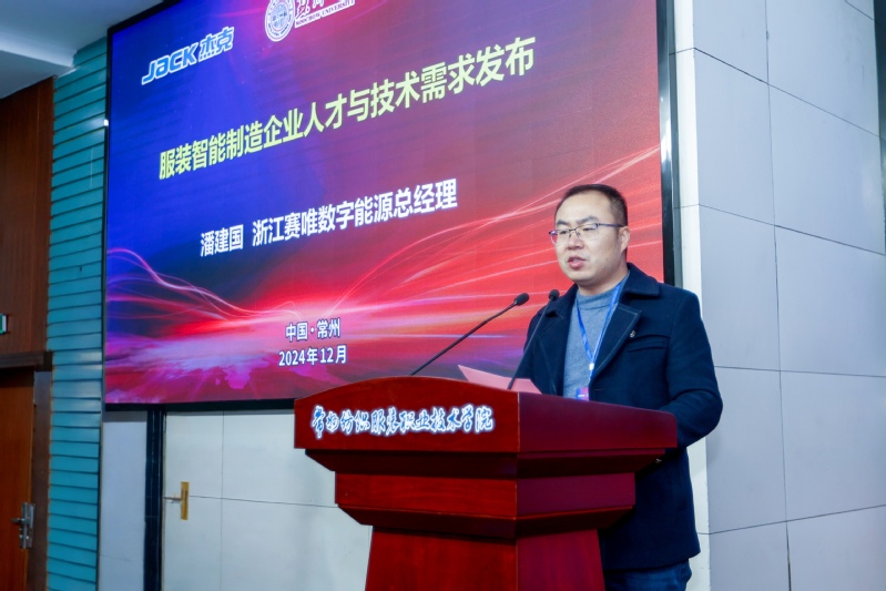 杰克科技股份有限公司总裁胡文海对共同体成立以来的工作进行了总结,并制定了下一年度工作计划。党委副书记、校长洪霄、杰克科技总裁胡文海分别代表双方签署了“校企协同创新合作协议”,通过共建服装智能制造技术创新与应用平台,进一步深化校企合作。常州市科教城管委会副主任庄三舵、常州华利达服装集团有限公司副书记钱震宏共同为“常州市纺织服装工匠学院”揭牌,希望通过共建工匠学院,培养更多具备工匠精神的纺织服装人才,推动纺织服装行业技术创新。为表彰杰克科技在产教融合领域做出杰出的贡献,校党委委员、副院长张文明代表我校授予杰克科技产教融合“突出贡献奖”。江苏省纺织工业协会副秘书长张彬发布了江苏省2025年《缝纫机械装配调试工》职业技能等级认定,这将为服装智能制造领域的人才培养标准和技能评价规范。我校智能制造学院院长李爱红发布了我校机电一体化技术(服装智能装备方向)人才培养方案。浙江赛唯数字能源总经理潘建国发布了服装智能制造企业人才与技术需求。