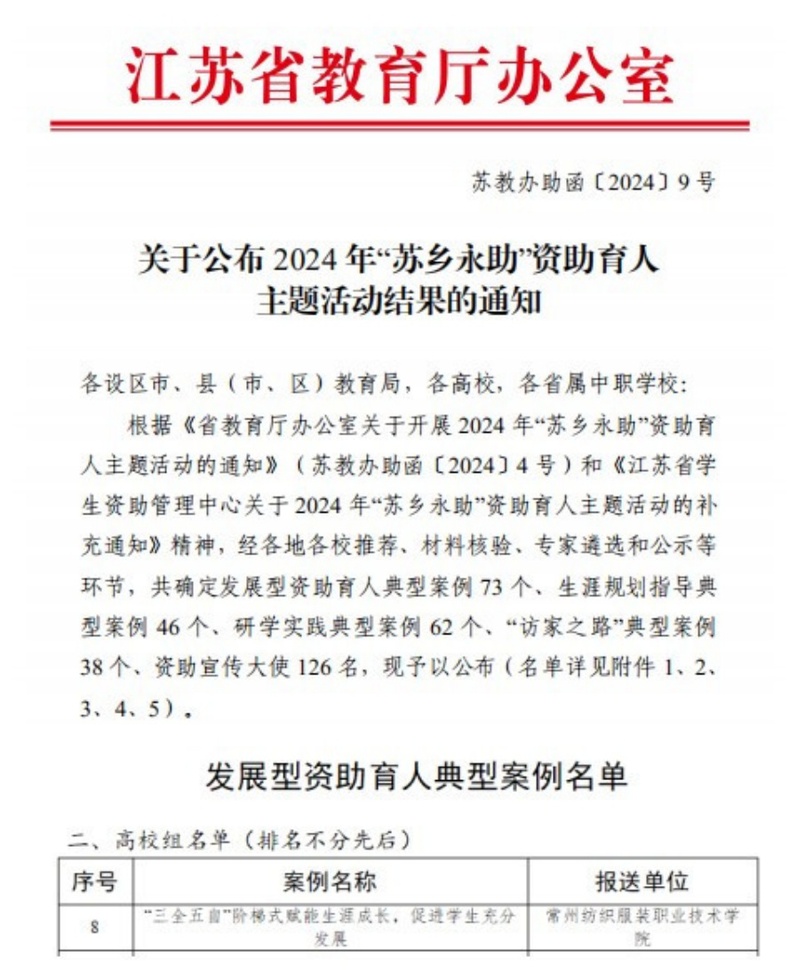 近日,江苏省教育厅公布了2024年“苏乡永助”资助育人主题活动的结果,我校数字商贸学院的辅导员冯益芙老师撰写的《“三全五自”阶梯式赋能生涯成长,促进学生充分发展》获评发展型资助育人典型案例。