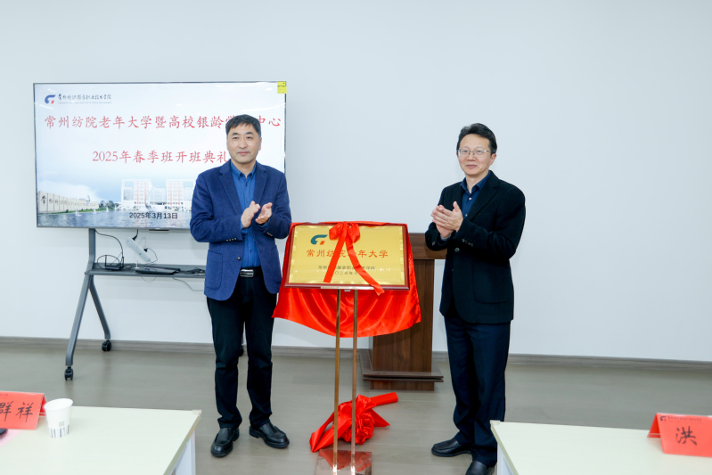 典礼开始,张文明代表学校致欢迎辞,从前期规划调研、建设论证讨论、学校改造建设、课程设置研讨、社区宣传推广等方面回顾了我校老年大学的前期筹备情况。丁皓处长代表常州市教育局宣读《关于成立常州纺院老年大学的批复文件》,丁皓处长在宣读批文时强调:支持高校开办老年大学,是常州市推进老年教育高质量发展的重要举措。会议在轻快的音乐声中迎来重要时刻,教育局俞群祥副局长与洪霄校长共同为常州纺院老年大学揭牌,随着红绸缓缓落下,“常州纺院老年大学”金色牌匾正式亮相。一份批文,一份责任;一份认可,一份使命!相信在常州市教育局的指导下,学校的坚强领导下和社会各界的关心下,常州纺院老年大学定会越办越好。