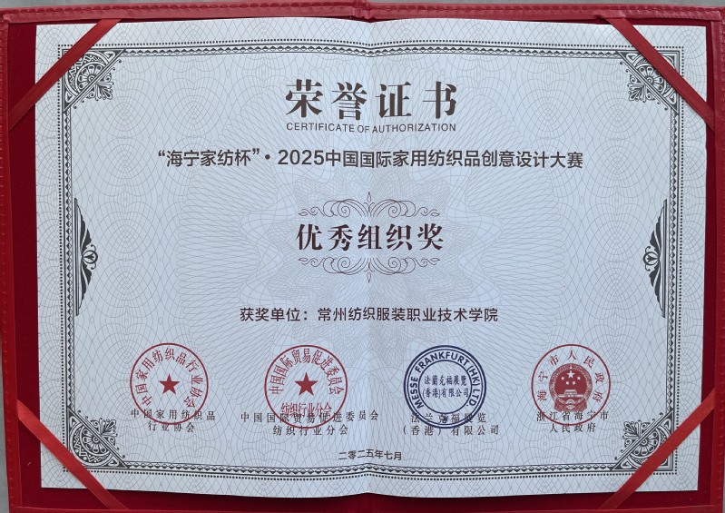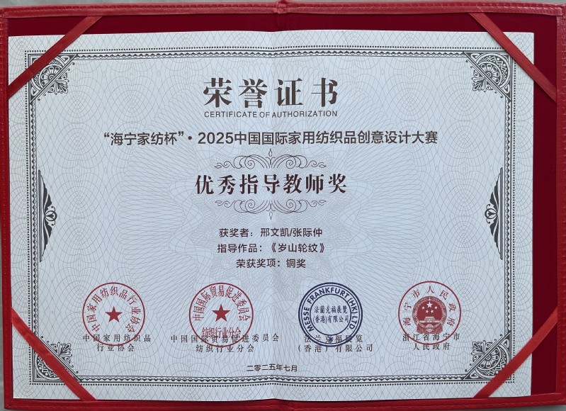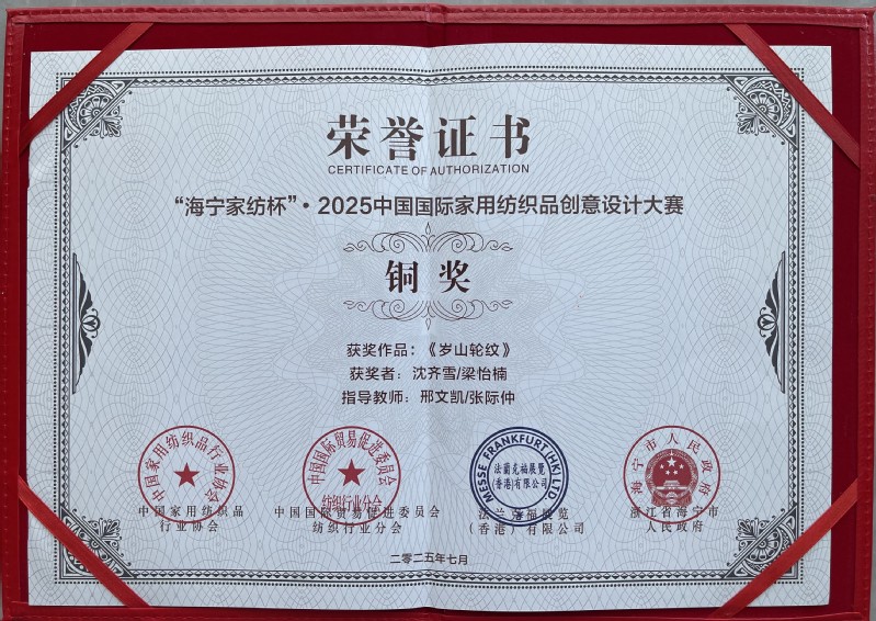 8月16日,“海宁家纺杯”2025中国国际家用纺织品创意设计大赛在浙江海宁圆满落下帷幕。我校服装与时尚设计学院设计2331沈齐雪、梁怡楠参赛作品《岁山轮纹》(指导老师:邢文凯、张际仲)荣获家纺创意画稿组“铜奖”,设计2331陈雨月参赛作品《瓷语织梦》(指导老师:周颖)获“入围奖”,邢文凯老师、张际仲老师获“优秀指导教师奖”,我校荣获“优秀组织奖”。